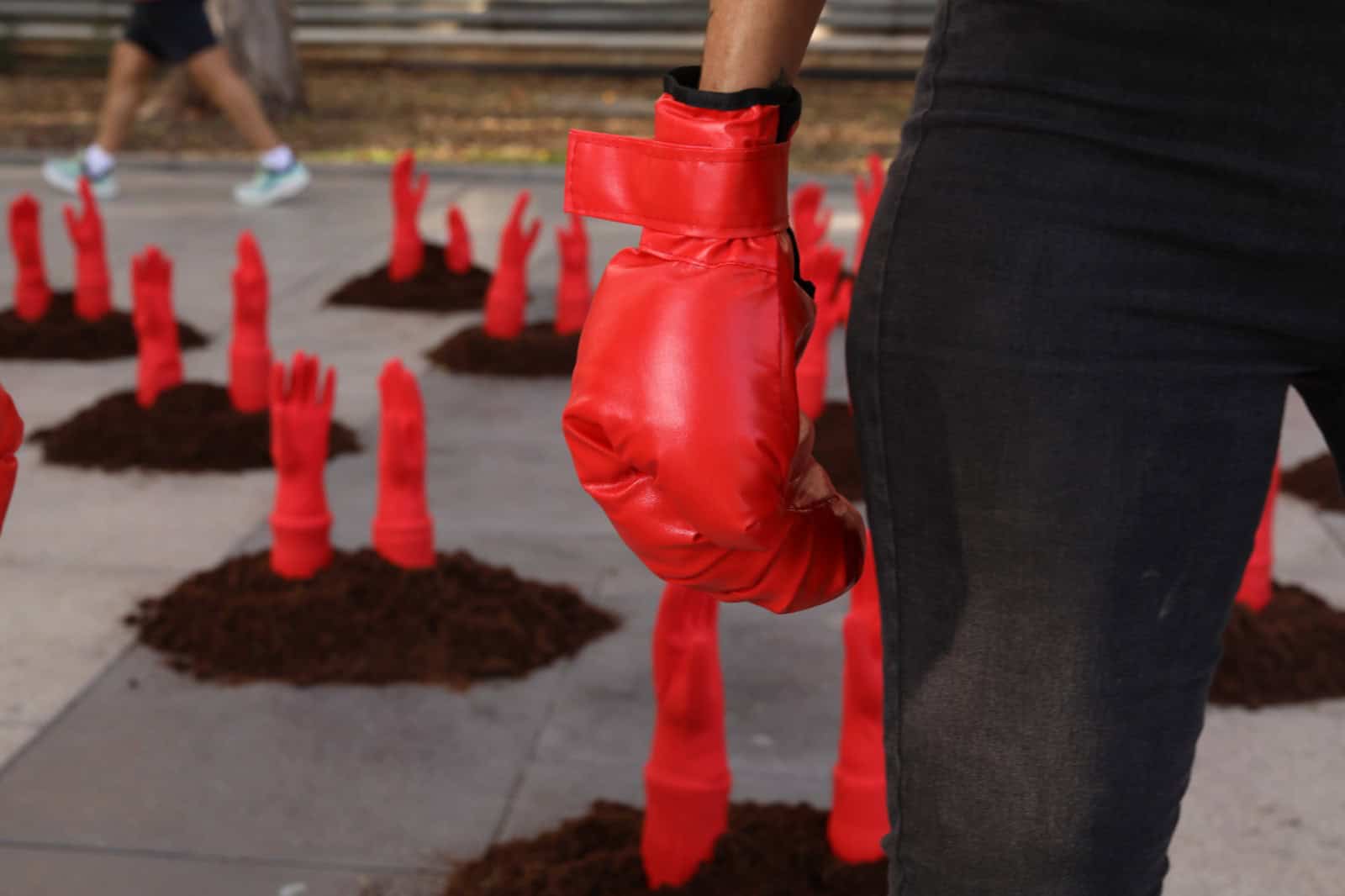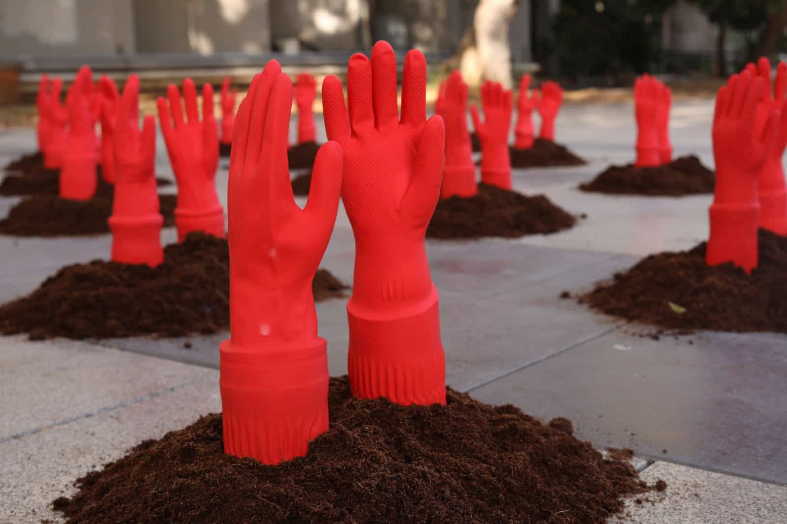 עשרות ידיים אדומות זקורות מן האדמה קידמו אתמול את פני העוברים והשבים ברחבת בית משפט השלום בתל אביב. המיצג, שהוצב על ידי עמותת המכללהּ לקראת היום הבינלאומי למאבק באלימות כלפי נשים, ביקש לזעוק את זעקתן של נשים רבות בישראל הסובלות מאלימות, הדרה ופגיעוּת מתמשכת. על הרצפה הוצבו כשלושים רגבי אדמה המדמים קברים, ומהם בלטו זוגות ידיים אדומות עשויות כפפות, רמיזה כואבת לסיפורה של ליטל מלניק ז"ל שנקברה בחייה, אך גם סמל לנשים רבות שנדחקות בכל יום לשולי החברה – בזנות, בעוני, באלימות במשפחה ובפגיעות מיניות. לצדן עמדו פעילות העמותה, מצוידות בכפפות אגרוף אדומות כסמל למאבק המתמשך.
